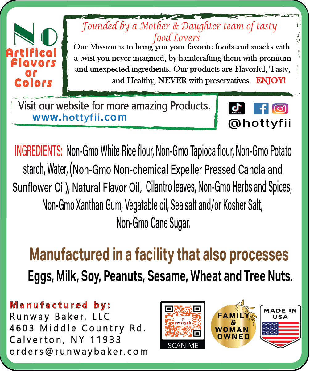 Non-Gmo White Rice flour, Non-Gmo Tapioca flour, Non-Gmo Potato starch, Water, Non-Gmo Sunflower, Canola oil), Non GMO Cane Sugar, Cilantro, Non-Gmo Herbs and Spices, Non-Gmo Xanthan Gum, Palm oil, Sea salt and/or Kosher Salt