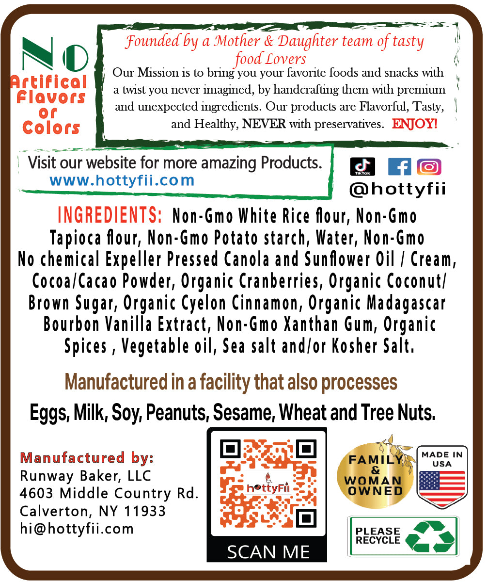 INGREDIENTS: Non-Gmo White Rice flour, Non-Gmo Tapioca flour, Non-Gmo Potato starch, Water, Non-Gmo No chemical Expeller Pressed Canola and Sunflower Oil, Cocoa/Cacao Powder, Non- Gmo Cane/Brown Sugar, Organic Cyelon Cinnamon, Organic Madagascar Bourbon Vanilla Extract, Non-Gmo Xanthan Gum, Vegetable oil, Sea salt and/or Kosher Salt.