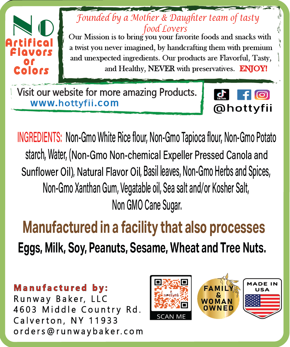 Our Gluten Free Wonderful Basil crunchy Crisps made with Non-Gmo Rice flour and Fresh Basil leaves with herbs and spices. Each crisp is made with our special blend of all-natural ingredients with sea salt giving them that satisfying crunch no matter how you eat them. Dip them, top them, or eat them on their own, you're sure to enjoy this healthy snack and you will come back for more.