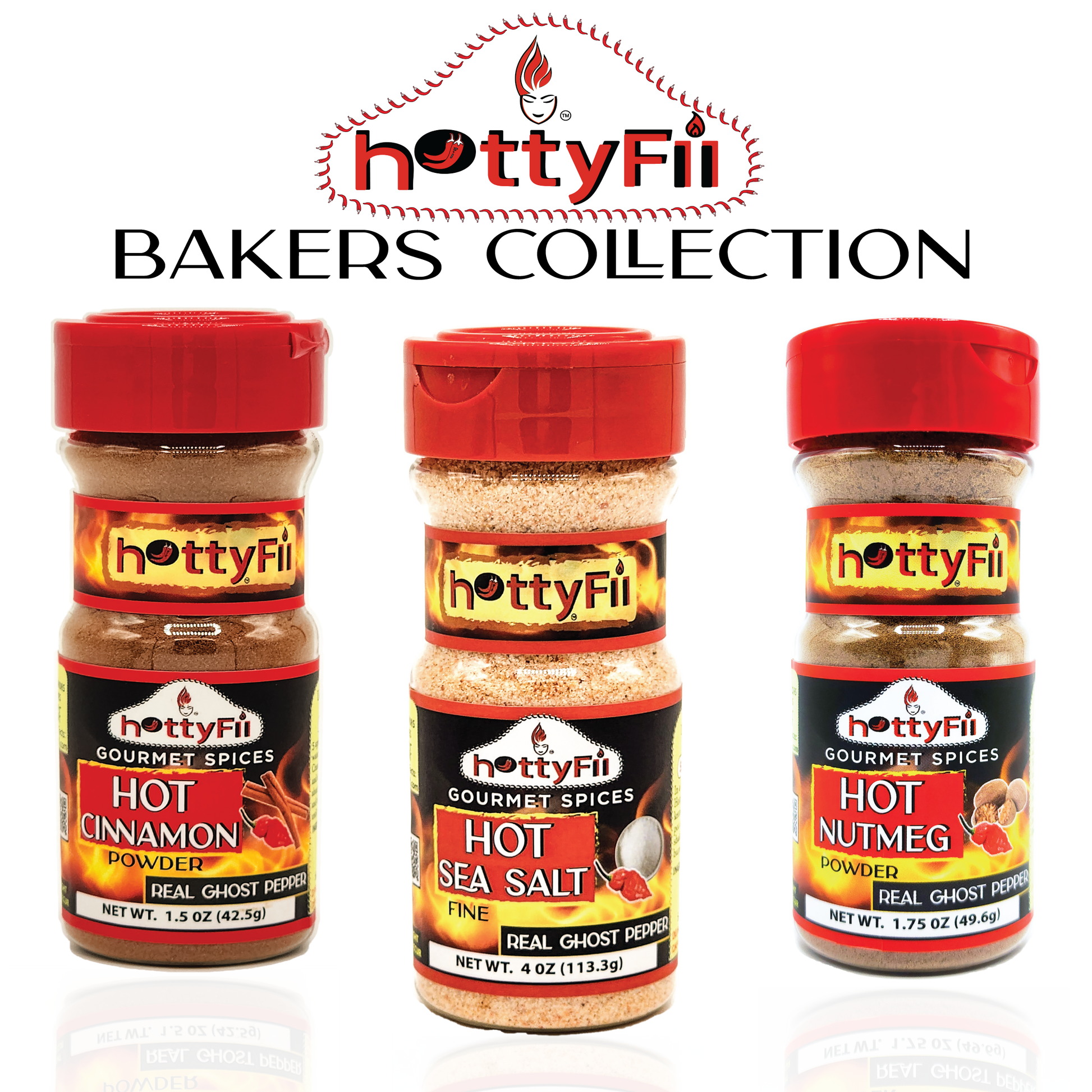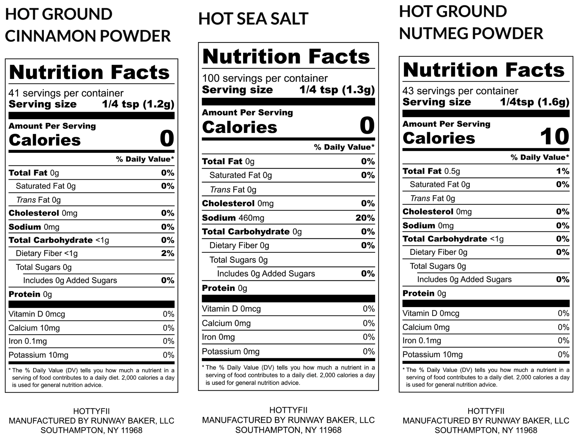 Ground Nutmeg Powder , Ground Cinnamon Powder, Pink Himalayan Sea Salt, Ghost Pepper Powder, and Chili Pepper Powder.
